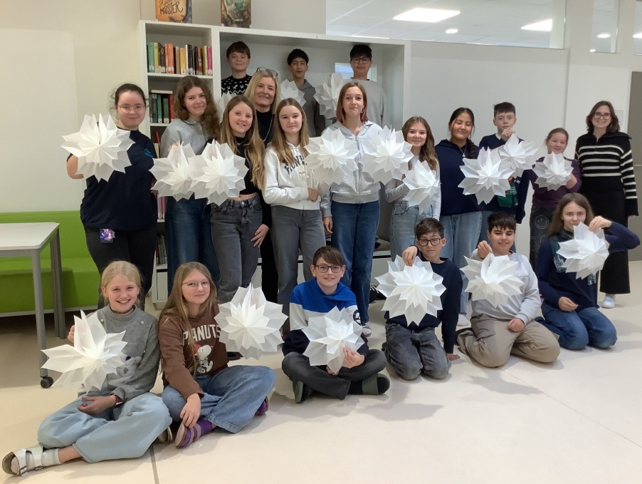 Tolle Weihnachtssterne aus Butterbrottüten haben die Schüler:innen der 2c in Deutsch gebastelt.