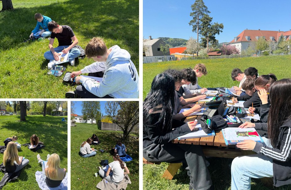 An einem so herrlichen Tag findet der Zeichenunterricht der 4b drauĂen statt.